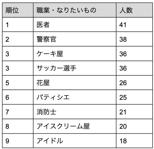 また、ママ(2名)、パパ(1名)、パパと一緒の仕事(1名)といった微笑ましい回答やお姫様(3名)、魔法使い(2名)、お金持ち(1名)、社長(1名)といった夢のサイズが大きな回答もありました。