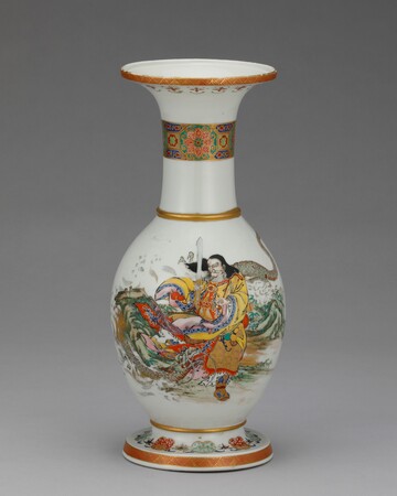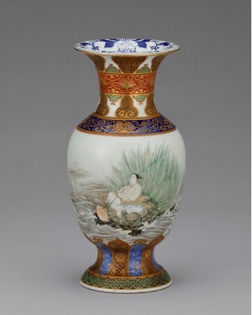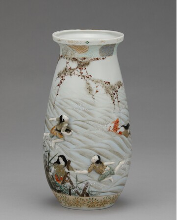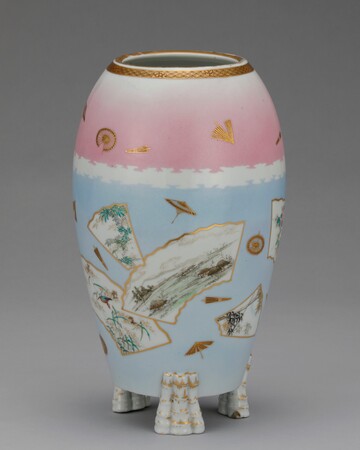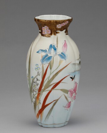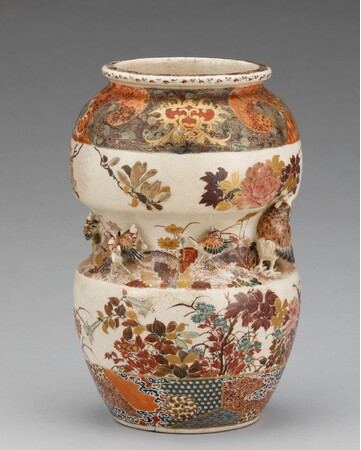 安政6年(1859)に横浜が開港した以降、東京や横浜にも新興の窯業産地が誕生しました。陶磁器に適する土が産出しない東京や横浜へ、生産地から土を運び生産を始める者も現れます。明治3年(1870)、宮川香山は輸出用陶磁器を制作するため京都から横浜へ移り、翌年に西太田で開窯しました。細密な文様と金彩を施した豪華な京薩摩をベースとし、器面に造形物を貼り付ける高浮彫(たかうきぼり)を大成させ、欧米で人気を博します。瀬戸の井上良齋も同8年(1875)、隅田川沿いの浅草橋場に登り窯を築きました。同様に高浮彫の技法を用いてユニークな作風の隅田焼をつくり、製品は専ら輸出向けとして横浜港から海を渡っていきます。また、海外でいち早く人気を得ていた薩摩焼の様式で、「東京薩摩」「横浜薩摩」と称される陶器がつくられました。東京では成瀬誠志や三彌舎など、横浜では保土田商店や服部などが活躍した記録が残っています。芝の増上寺に窯を築いた成瀬誠志は薩摩焼細密画の元祖とも呼ばれ、保土田商店は鹿児島などから素地を横浜へ運んで上絵付けしました。
