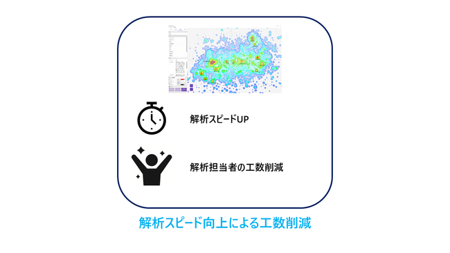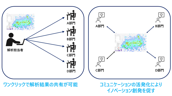さらに本製品は解析結果と合わせて社内に共有頂けます。関係者間でのスムーズな情報共有や、各部門の知見を元にした結果の解釈にお使い頂けるため、部門間のコミュニケーションの促進や、新たなイノベーション創発を促すことが可能となります。