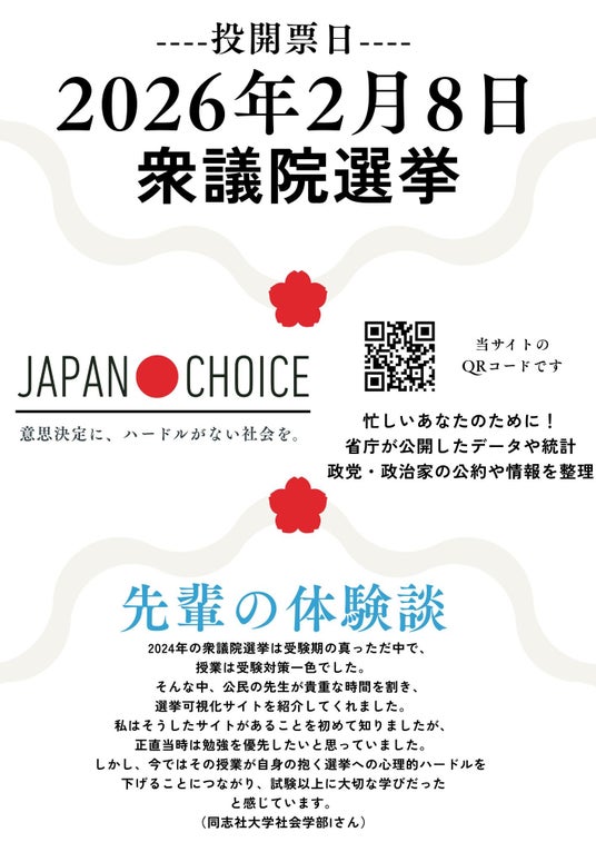 「投票の量と質を向上させ、民主主義を前進させる」ために活動する NPO 法人Mielka は、 2026 年 2 月に実施される衆院選議員総選挙に向け、 投票のために必要な全ての情報を集めたプラットフォーム「JAPAN CHOICE」を1月31日(土)に正式リリース致しました。