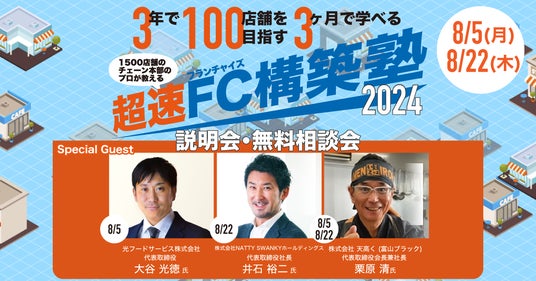 「超速FC構築塾2024」は「3年で100店舗を目指す」をキャッチフレーズに掲げ、フランチャイズ本部の構築・運営を行う上で必要な知識を学べる全6回の特別講座です。