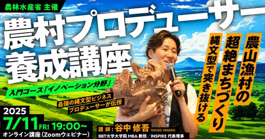 国内最大級の地方創生イノベータープラットフォーム「INSPIRE(インスパイア)」を運営する一般社団法人INSPIRE(所在地:東京都渋谷区)創設者の谷中修吾代表理事(BBT大学大学院 経営学研究科 MBA 教授)が、農林水産省主催「農村プロデューサー養成講座」において、2025年7月11日(金)にイノベーション分野のオンライン講義を行います。