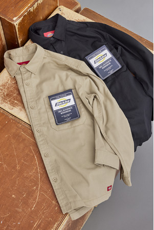 ワークシャツは『Dickies』定番の厚みのある丈夫なTCツイル素材を使用し、作業着としての特徴を残した大き目のフロントポケットを取り付けています。パンツもシャツと同素材を使用しながらもデイリーに取り入れやすいようにウエストゴム仕様で履きやすく仕上げています。