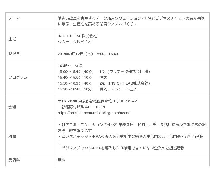 2019年9月12日(木)、RPAを利用したビッグデータ活用支援を手掛けるINSIGHT LAB(本社:東京都新宿区、代表取締役:遠山 功、以下、INSIGHT LAB)は、ビジネスチャット・社内SNS「WowTalk(ワウトーク)」を提供するワウテック株式会社(以下、ワウテック)と、RPAとビジネスチャットという切り口からデータ活用をテーマとした共催セミナーを開催いたします。