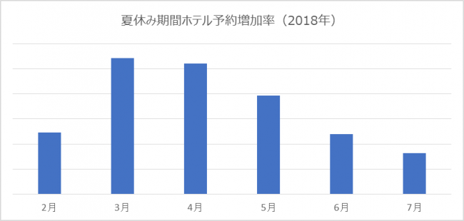 最大10連休となった今年のゴールデウィークに続いて、大型連休となるお盆休み。今年は山の日(8月11日)が日曜日になることから、12日が振替休日になる関係で最大9連休になるとされています。Trip.com上における2018年夏休み期間のホテルの予約状況を調べたところ、予約のピークは7月でしたが、3月から4月にかけて予約が急増。2月に比べ、3月の予約数は約4倍に増えるなど、長期休暇の旅行は事前に予約をする人が多いことがわかりました。