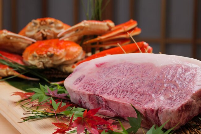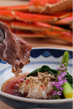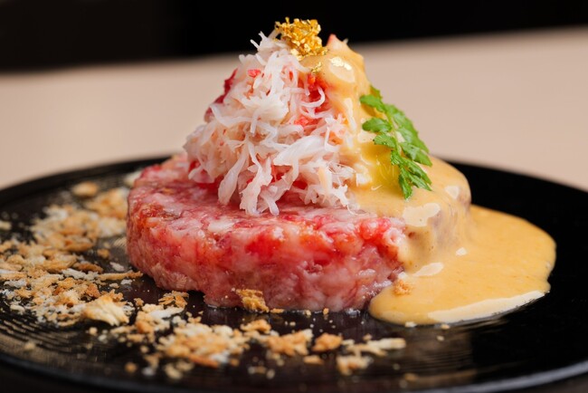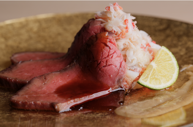 蟹はタラバガニを使用し、和牛のたたきは低温調理でランプ肉を焼き目をつけて丁寧にカット。たたきの特製タレは風味豊かな味わいを演出し、蟹味噌ソースによって一層の美味しさが引き立ちます。贅沢な食事の一品としてお楽しみください。