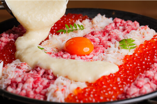 お米は風味豊かな貝出汁で炊き上げ、厳選和牛のユッケ、イクラ、蟹がふんだんに盛り付けられています。中央に鮮やかな卵黄が映え、最後に期間限定のカマンベール、マスカルポーネ、クリームチーズ、チェダーチーズの4種類のチーズを合わせたチーズソースを混ぜ合わせることで、絶妙な組み合わせとクリーミーな味わいが広がります。たっぷり注がれるチーズソースでリゾット風に仕上がる『映えリア』は美味しさと贅沢さを楽しめる最高の一品です。
