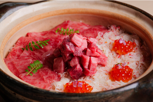 鳥取県産の田中農園のお米と魚介の出汁で炊き上げる土鍋ご飯の上に、サーロインと蟹が盛られ、中央にはヒレの角切りが特製タレに漬け込まれて盛り付けられます。蟹の上にはいくらの醤油漬けがトッピングされ、混ぜ合わせることで、サーロインの甘味と蟹の風味が融合した至極の一品となります。