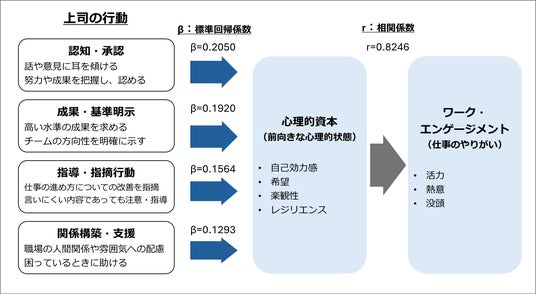 ワーク・エンゲージメントの要因の一つとして知られる、前向きな心理状態を意味する「心理的資本※2」との関係を分析したところ、相関係数は0.8246と極めて高い値を示しました。