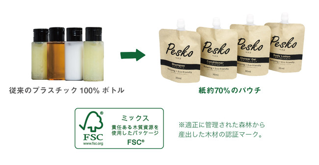 そこで、これら問題を解決するため、パッケージにFSC認証の環境に配慮したクラフト紙を使用し、プラスチック使用量を大幅に削減した『Pesko』を発売致しました。
