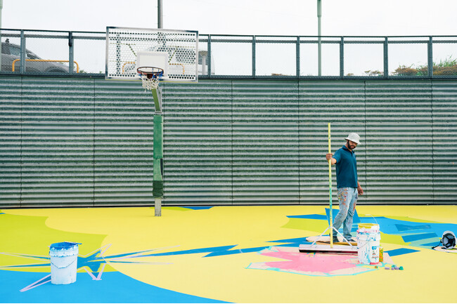バスケットボールのアートコートで数多くのプレイグラウンドを蘇らせてきたアメリカのプロジェクトチーム「PROJECT BACKBOARD」と、アートコートの世界的なアワードを受賞した日本のプロジェクトチーム「go parkey」がタッグを組んで手掛けたリノベーション・アートコート。アートワークは、レディー・ガガの履く「ヒールレスシューズ」の作者としても知られるアーティストの舘鼻則孝が担当した。今回、舘鼻が手掛けたアートコートのサイズは横34m × 縦17mとなり、舘鼻史上最も大きな絵画作品であり、初めてのパブリックアートでもあります。
