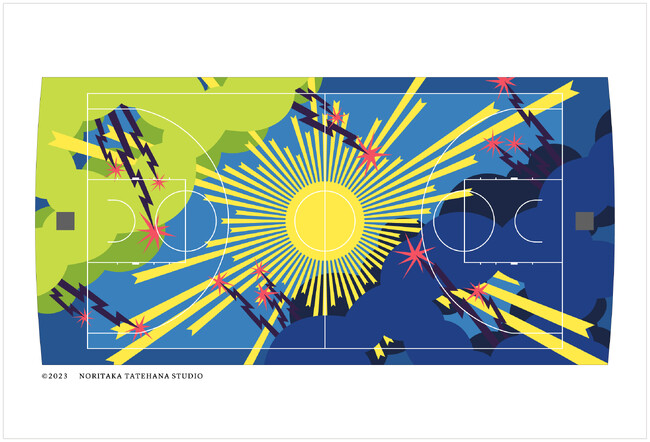 プロジェクトを始動するにあたって、「go parkey」の代表を務める海老原奨さんとのディスカッションの中で、「晴れてくれないと僕らはゲームができないんです」というお話を伺い、そのようなエピソードからインスピレーションを受けたと舘鼻は語っています。屋外コートをメインに活動する海老原さんのようなバスケットボールプレイヤーにとっては、天候がゲームを左右することもあり、とても重要な要素なんだということから着想を得て本作の作画が始まりました。