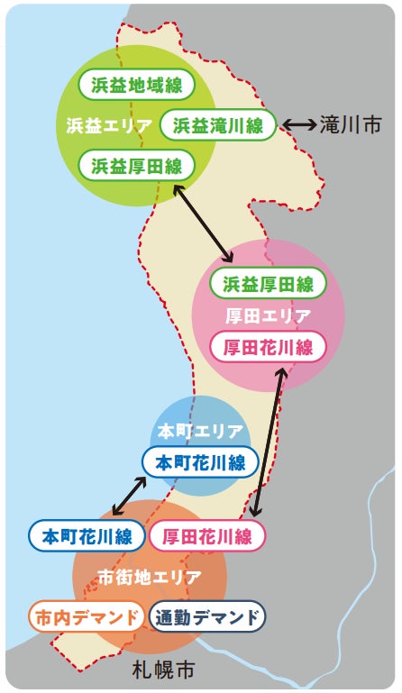 - 市内デマンド:生振・緑苑台・花川地域等、中心市街地の日常生活を支える足。