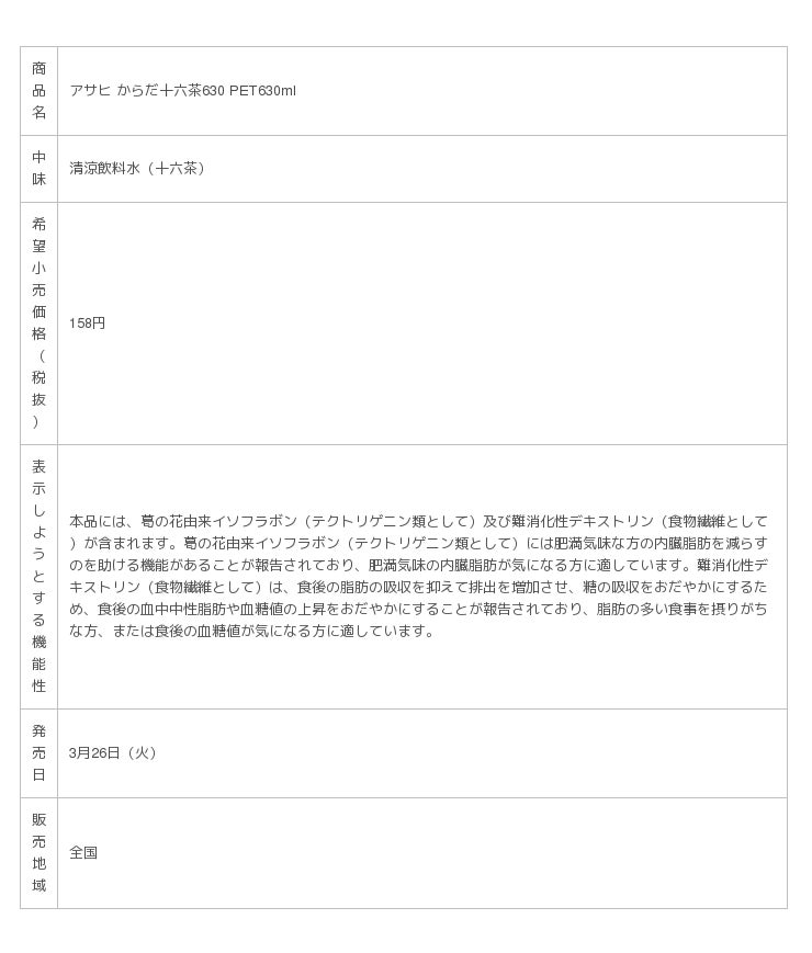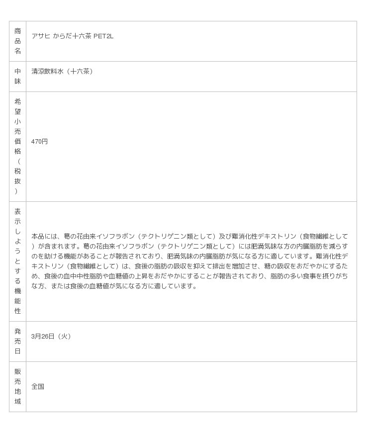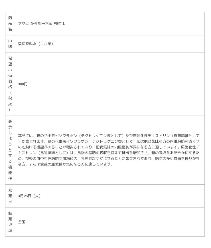アサヒ飲料株式会社(本社 東京、社長 岸上 克彦)は、“内臓脂肪を減らすのを助ける”“食後の脂肪の吸収を抑える”“食後の糖の吸収をおだやかにする”「3つのはたらき」がある機能性関与成分をもつ「アサヒ からだ十六茶」を全国で、2019年3月26日(火)からリニューアル発売します。