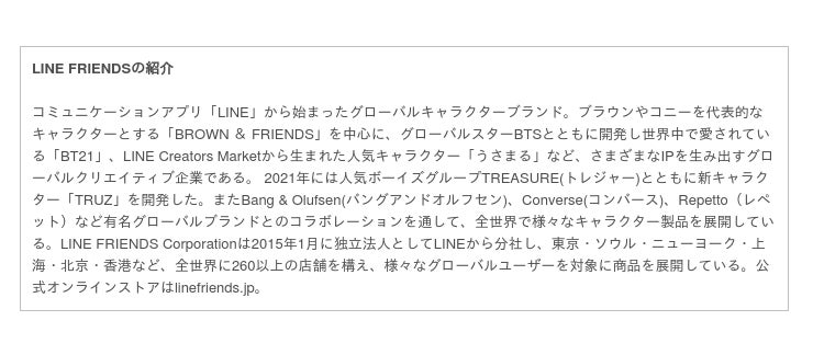 LINEスタンプから誕生し、ゲーム、ファッション、エンターテイメント等に事業を拡大しながら、グローバルキャラクタートレンドをリードしてきたLINE FRIENDSと、音楽とファッションレーベルとしてスタートし、F&B等に裾野を広げライフスタイルブランドとして確立したMaison Kitsunéという、互いに個性的な背景を持つ2ブランドのコラボ。