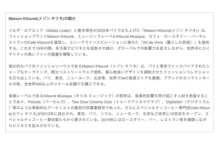 Maison Kitsuné(メゾン キツネ)はフランス語で家を意味する「メゾン」と日本の「キツネ」に由来しており、狐のように自由に変身を繰り返すスピリットで、トレンドをリードしているブランド。音楽レーベル、ファッションハウス、カフェ等にも領域を拡大し、キツネのシンボルにカジュアルと高級感が絶妙に同居するスタイルで、ファッション感度の高い若者をはじめ幅広い世代から熱い支持を得ています。
