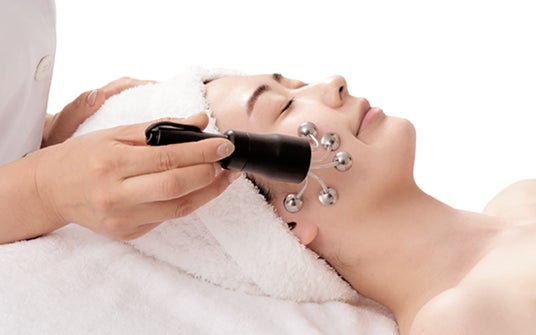 美顔筋SOSEIの理論を体現したオリジナルマシン「TERA Baller」。赤筋に対して効率的に働きかけるために開発された表情筋のトレーニングマシンで、赤筋専用電流とテラヘルツ派(1秒間に1兆回微振動する電磁波)の作用でお顔のエイジングサインの根本原因にアプローチ。