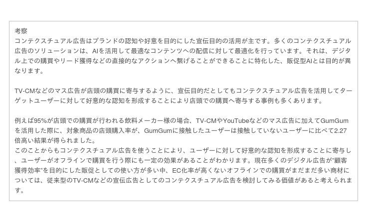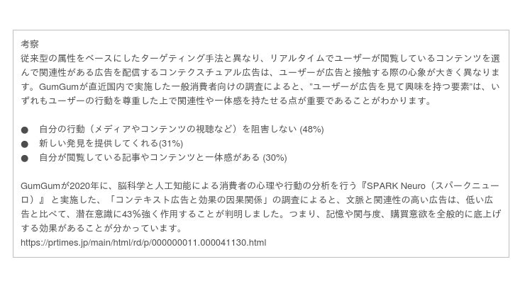 コンテクスチュアル広告の使い方を仕組み化した、”Context Discovery( コンテキスト・ディスカバリー)”というワンストップソリューションを提供しており、コンテクスチュアル広告を一つのメディアとして扱うだけでなく、配信結果からコンテキストに紐づいたインサイトを抽出することにより、ブランドにとって適したユーザーの興味や、モーメントを理解することが可能です。