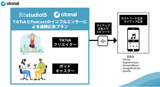 この度、studio15はオトナルと連携し、「TikTokクリエイター×ポッドキャスター広告」の提供を開始します。これによって、TikTokクリエイターとポッドキャスターのそれぞれのフォロワーに対して、拡散力と理解促進・共感を両立するインフルエンサーマーケティングの実現が可能になります。
