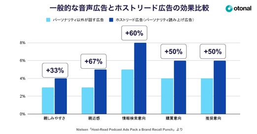 米国の調査会社ニールセンの調査(*4)では、ホストリード広告は、アナウンサーなどによるホストリードではない音声広告と比較して、購買意向などの広告効果が平均で50%以上高くなることが調査結果として示されています。
