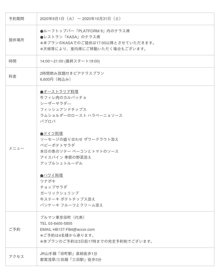 仏・アコーが展開するプレミアムホテルブランドのプルマン東京田町(所在地:東京都港区芝浦3-1-21 総支配人:ディーン・ダニエルズ)は、ドイツ料理やオーストラリア料理など、食を通じて海外旅行気分を味わえるビアテラスプランの販売を開始いたしました。
