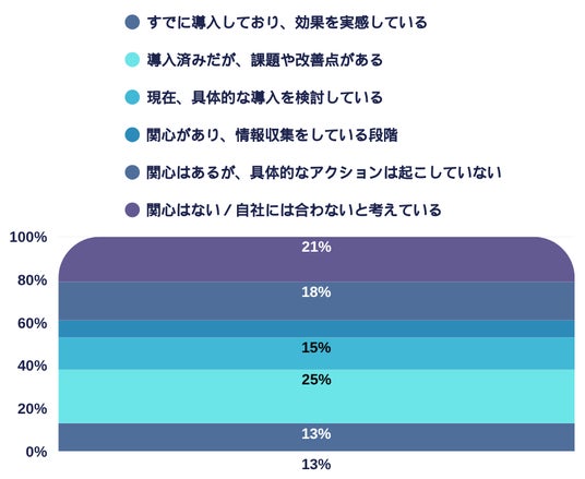 しかし、導入済み企業(76社)の内訳を見ると、「課題あり」が「効果実感」の約2倍にのぼり、理想通りに運用できている企業は少数派であることが明らかになりました。また、「関心がある」と回答した層(41%)の中でも、具体的なアクションを起こせていない企業が多く、先行する企業の苦戦が、導入検討中の企業の二の足を踏ませている可能性も考えられます。