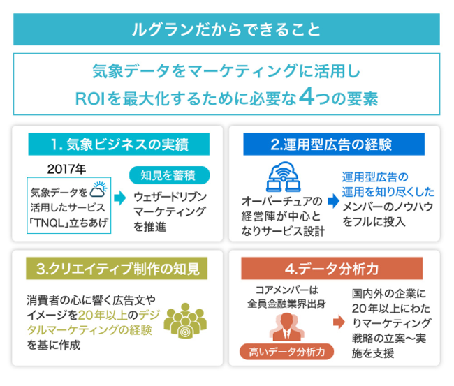 「weathermarketing.net」は、ルグランの20年に及ぶ運用型広告の管理・最適化の経験と、2017年のサービス提供開始以来、累計約25万人が利用した気象連動型コーディネート提案ツール「TNQL(テンキュール)」で培われた気象データ活用の知見の融合することで開発された、画期的な広告配信システムです。