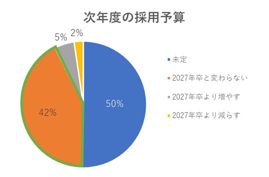 約半数が採用計画「未確定」ではあるが、採用予定数において「前年並み」とする企業が5割弱を占めており、引き続き前年据え置きの傾向が続くと予想される(図9)。一方、次年度の採用予算に関しても「前年並み」が4割強を占めており、予算面でも大きな増減は見られない(図10)。