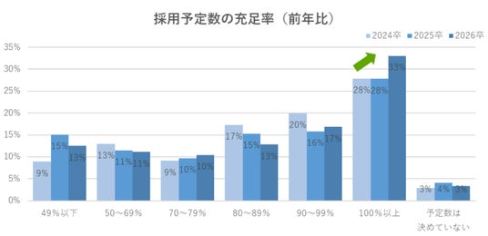 採用予定数は、「前年並み・増加」が大多数を占めており、依然として採用意欲の高い状態が続いている(図1)。回答時点で充足率が「100%以上」に達している企業は全体の3分の1となり、この3カ年の中では改善傾向。一方で、前年同様、半数を超える企業が未だに予定通りの採用人数を確保できていない状況が続いている(図2)。