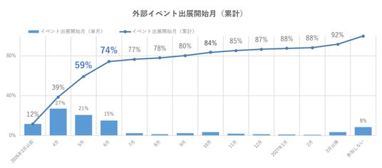 外部イベントの出展開始についても同様に4~6月に集中している。5月までに6割近くが出展し、6月には7割を超える結果となった。参加しない企業はわずか8%にとどまっており、早期からの外部イベント出展に意欲的な企業が多数を占めていることが分かる(図12)。