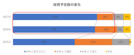 採用予定数を「増加」とする企業は前年より5ポイント減少し、「変わらない」は2年連続で7割を超えている。採用意欲はあるものの充足できない状況が続いており、予定数の引き上げには慎重にならざるを得ない状況であると読み取れる(図3)。