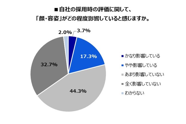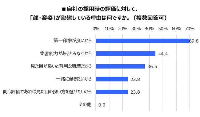 「顔・容姿」に関しても同様の質問を行ったところ、「かなり影響している」が3.7%、「やや影響している」が17.3%と、21%の人が「影響している」と回答しました。理由としては、「第一印象が良いから」が69.8%、「集客能力があるとみなすから」が44.4%、「見た目が良いと有利な職業だから」が36.5%と続きました。3つのどの項目に関しても、入社後の活躍人材を確保するためにある一定のバイアスをかけて採用を判断している担当者がいることが明らかになりました。