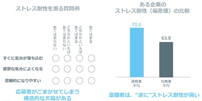 ローパフォーマーや退職者を出してしまう要因のひとつとして、適切な適性検査を使用していないことが挙げられます。例えば、適性検査でよく見かける「リーダーシップ」や「ストレス耐性」に関する質問は、入社後の活躍や定着と関係ないことが分かっています。このような優劣のある質問は、応募者がごまかせてしまう構造的欠陥があるだけでなく、そのようなスコアが高い人が退職しにくいとは限らないという問題点があります。
