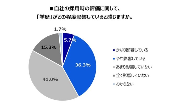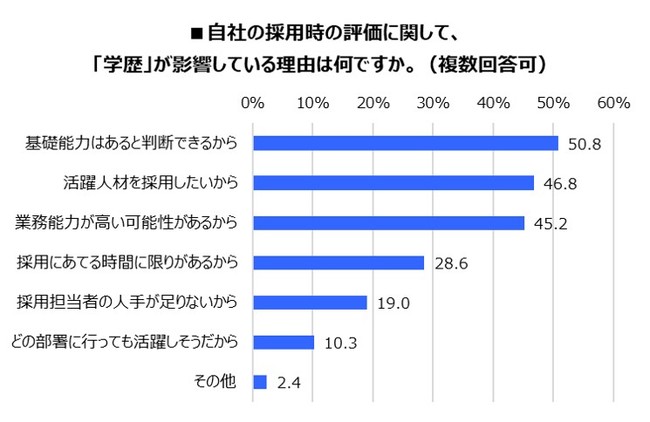 人事・採用担当者に「自社には採用時にバイアスがかかっていると思うか」と聞いたところ、「はい」と答えた人は46%と、約半数の会社で採用時に何らかのバイアスがかかっていることが分かりました。また、学歴・性別・容姿といった項目別で「自社の採用時の評価に関して各項目がどの程度影響しているか」質問しました。まず、「学歴」に関しては、「かなり影響している」が5.7%、「やや影響している」が36.3%と計42%の人が「影響している」と回答しました。その理由を聞くと、「基礎能力はあると判断できるから」が50.8%、「活躍人材を採用したいから」が46.8%、「業務能力が高い可能性があるから」が45.2%と続きました。