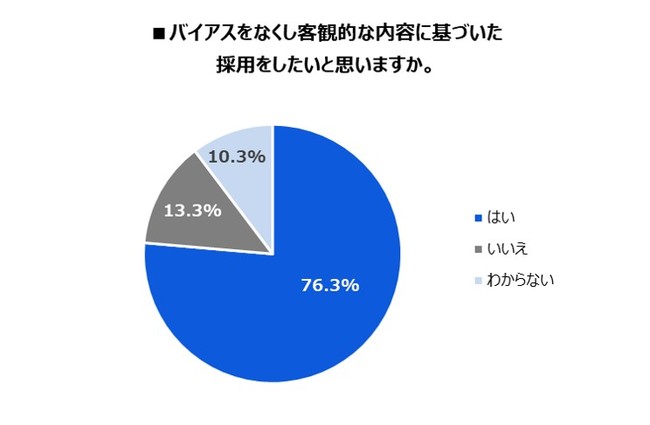 「バイアスをなくし、客観的な内容に基づいた採用をしたいと思うか」という質問には、76.3%もの人が「はい」と回答しており、勘や経験に基づく採用から脱却する必要があると考えていることが明らかになりました。
