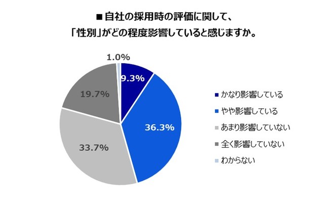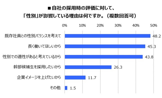 「性別」に関しては、「かなり影響している」が9.3%、「やや影響している」が36.3%と、45%以上が「影響している」と回答しました。理由としては、「既存社員との性別バランスを考えて」が48.2%、「長く働いてほしいから」が45.3%、「性別での適性があると考えているから」が43.8%とそれぞれ半数弱の人が回答する結果となりました。