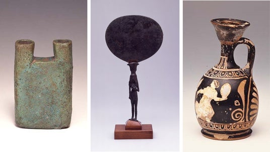 左から《ファイアンス製コール壺》 紀元前12世紀、エジプト / 《青銅製手鏡》 紀元前13-12世紀、エジプト / 《陶製香油壺》 紀元前5世紀、ギリシア