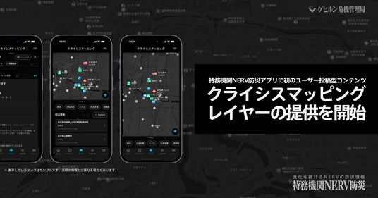 ゲヒルン株式会社(本社:東京都千代田区、代表取締役:石森 大貴、以下「ゲヒルン」)は、2024年9月9日に「特務機関NERV《ネルフ》防災」アプリをアップデートし、アプリ初のユーザー投稿型コンテンツ「クライシスマッピングレイヤー」機能を実装したバージョン v6.0をリリースしました。また、アプリは9月1日でリリースから5年を迎え、総ダウンロード数は620万回以上、月額課金を継続しているサポーター会員(※1)数は1万5000人以上になっています。ユーザーの皆様と、支援を継続してくださっているサポーター会員の皆様に感謝を申し上げます。