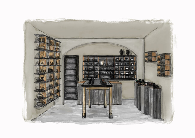 店内は、マドエレンが大切にする「手仕事」や「生々しさ」を体現するように、過剰に整うことを拒んだ不完全な世界観が表現されています。日本にローカライズした素材を積極的に使い、トラディショナルな日本らしさが散りばめられた空間は、パリの本店とも違うユニークな仕上がりです。