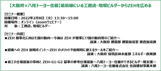 住宅設備販売会社のリーディングカンパニーとして様々な分野で前進し続ける八尾トーヨー住器株式会社(本社:大阪府八尾市/代表取締役社長 金子 真也/以下、八尾トーヨー住器)は、2022年2月8日(火)13:30~15:00オンラインにて大阪からZEH住宅を拡大することをテーマとした「脱炭素化社会に向けた省エネ国策と普及促進について~ZEH の時代到来!大阪から ZEH 拡大を!~」と題したセミナーを開催することをお知らせします。