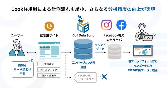 このたび「Call Data Bank」で、コンバージョンAPIへの連携が可能になったことにより、今までCookie利用の制限を受けて起こっていた計測漏れの割合を縮小させることができ、各プラットフォームからインポートしたデータとともに集計することで、さらなる分析精度の向上が実現します。