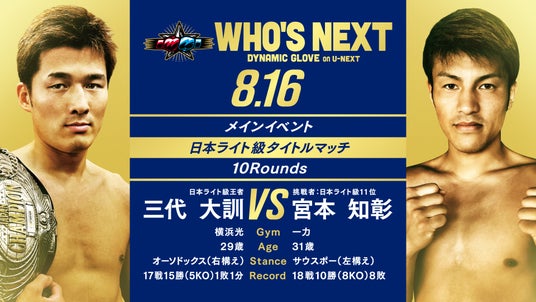 メインの日本ライト級タイトルマッチはチャンピオン三代大訓(横浜光)が同級11位の宮本知彰(一力)の挑戦を受ける。今年4月に仲里周磨(オキナワ)から奪った王座の初防衛戦である。