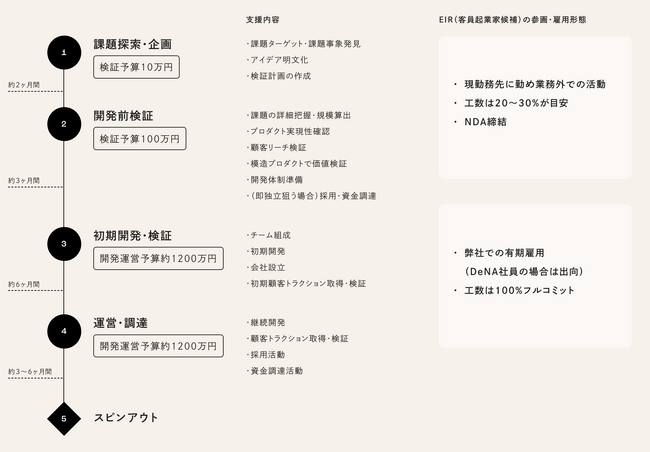 書類選考・面接を通過した起業家候補に対して、課題探索からスピンアウト(外部調達)までの各フェーズにおいて、デライト・ベンチャーズのプロ集団が伴走し、ともに事業立ち上げを行います。各プロセスに進むタイミングで予算を承認(投資判断)する形で、事業化を進めていきます。スピンアウトまでの流れは下記の通りです。