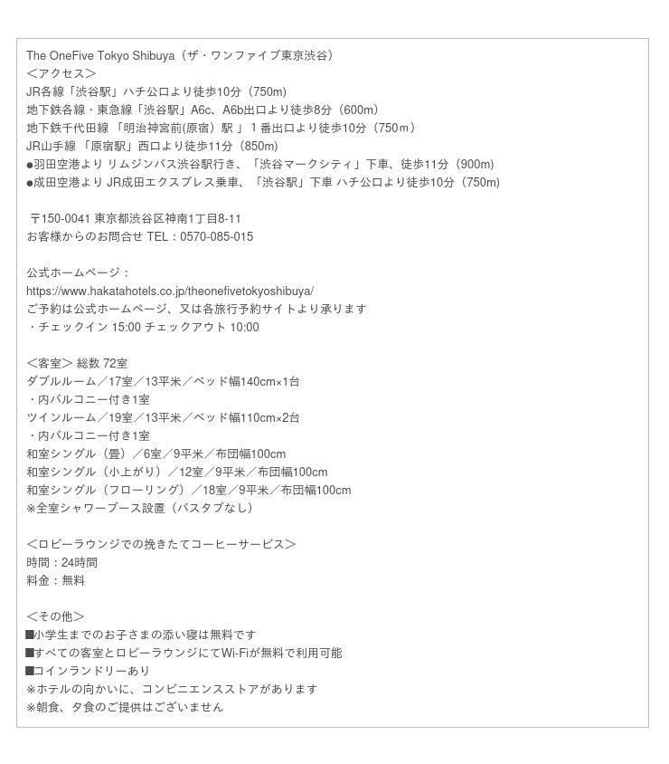 公式ホームページ:https://www.hakatahotels.co.jp/theonefivetokyoshibuya/