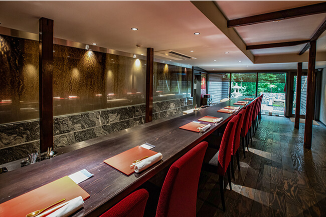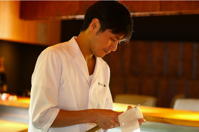 料理人の心を身近に感じ、期待感がいっそう高まった後は、貸切の店内のカウンター越しに笠原氏の調理デモンストレーションを見学。目の前で繰り広げられる一流の包丁さばきなど、料理が出来上がるまでのプロセスを楽しめます。
