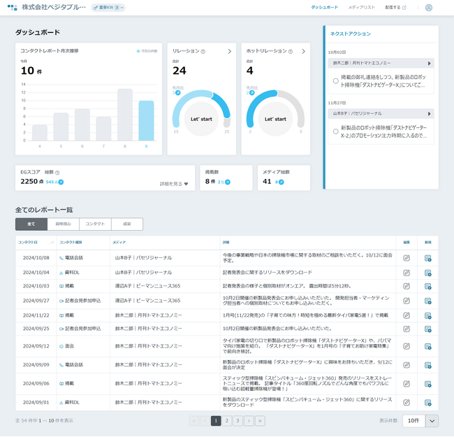 記者とのやりとりや問い合わせ、取材依頼、記事化の有無など、メディアコンタクト状況を一元管理することで、メディアとの良好な関係構築の手助けをします。また、担当者が次に取るべきアクションを忘れないよう、リマインド機能を搭載。広報・PRの機会損失を防ぎます。