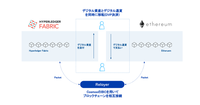 これまで、Hyperledger FabricとCosmos(Tendermint)間のDVP決済の検証は完了していましたが、今回、Hyperledger Fabricの接続先として実際にUSDCなどのデジタル通貨(ステーブルコイン)がすでに流通しているEthereumを対象としたことで、より商用化に近いレベルでの検証に成功しました。