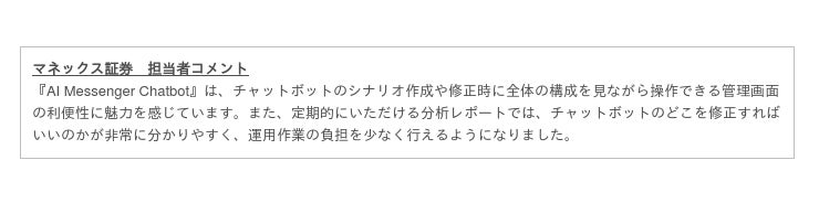 マネックス証券では、問題解決を効率的に行いたいという顧客の声に応え、顧客サービスの拡充として2017年12月よりAIチャットボットを提供しています。しかし、顧客満足度の高いチャットボットの提供には、継続した運用・改善が必要となるため、社内での運用負荷軽減および顧客の利便性向上を目的として、この度「AI Messenger Chatbot」を導入いただきました。