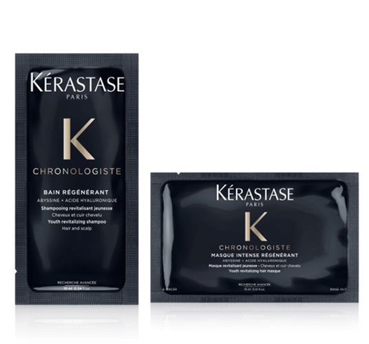 さらに、ご来場のすべてのお客様にサシェサンプルプレゼント「クロノロジスト」シリーズのシャンプー「バン クロノロジスト R」と、ヘアマスク「マスク クロノロジスト R」のサシェサンプルをプレゼントいたします。