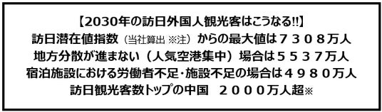 一方で、空港・宿泊施設などのインフラ不足や、人気都市への一極集中が続く場合には、訪日客数が5,537万人~4,980万人に留まる可能性も明らかになりました。
